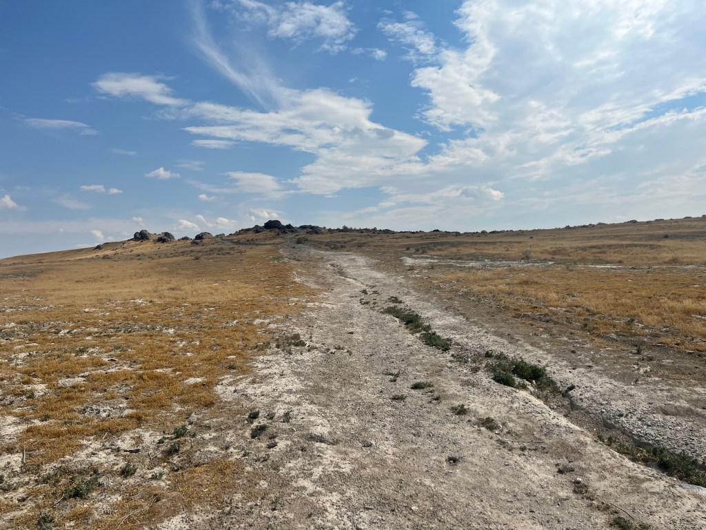 I did eventually get to the Utah border. It is funny how the landscape changes sometimes gradually and sometimes all at once. I looked off to my right and saw a red bluff and not to long after there was this long flat area that was white as borax. It was the Great Salt Lake. Some parts had water and some parts were dry with big chunks of salt.