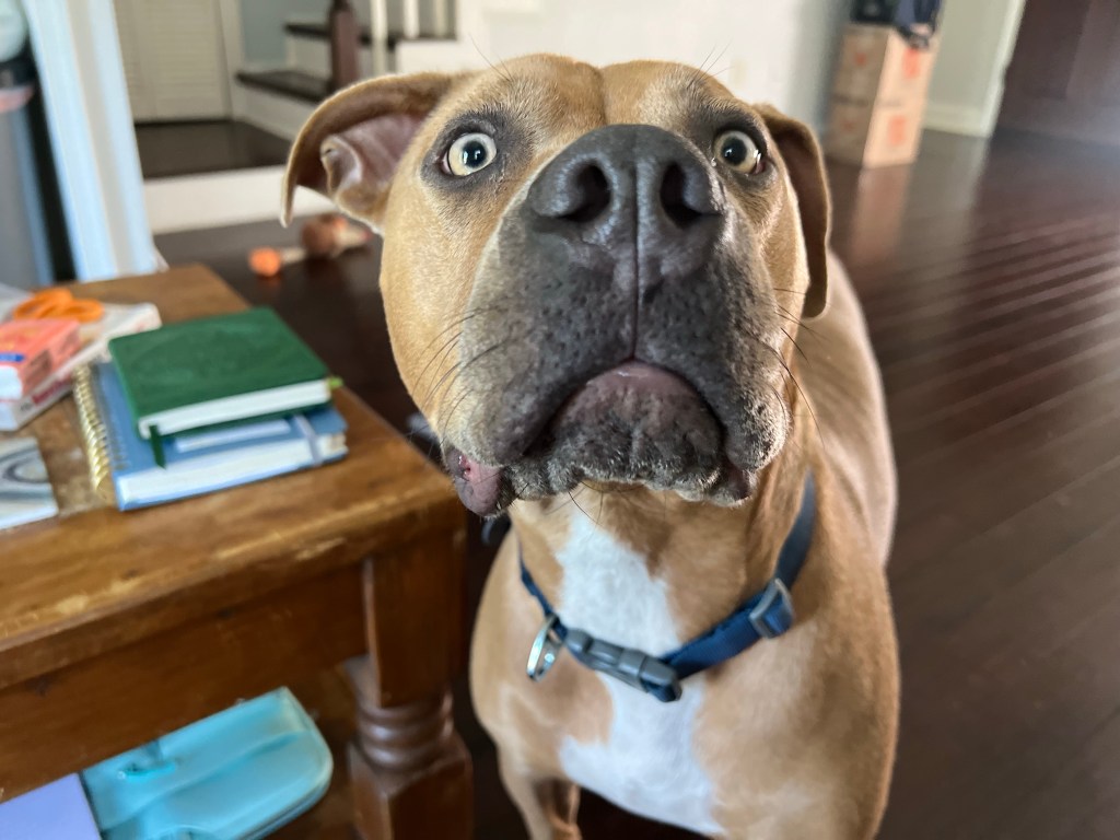 Oh, I should mention Circe got out this week. The door was ajar and she saw her chance and went. I didn’t notice right away, but panicked when I did. Totally freaked out is more like it, but after notifying animal control, driving up the road a bit and standing confused in the front wondering which way she would have headed off, I heard some barking. I headed in that direction through the woods to the neighbor’s house. Sure enough, she was there running around the house and barking. I called her and, of course, she didn’t come….I chased her around the house twice, then she ran into the woods on the other side and after a mad chase through the woods, we ended up at another neighbor’s house. I heard chickens and had this horrible vision of Circe grabbing a chicken. Anyway, long story longer….after checking out the goat pen she saw the barking dogs penned up and went over to them. While she was nose to nose with one, I tackled her and got her harness and leash on. Whew! There were some moments that I thought I might not be able to get her.
