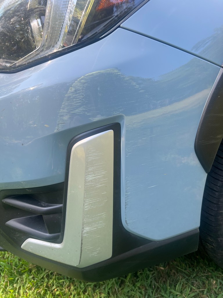 I drove home and parked without looking at my car and in the morning I noticed this scrape. The bummer is I didn’t do a walk around at the dealership. I just assumed if anyone did anything they would say something. So, now I am having to deal with the dealership and see if they are going to do the right thing and fix this. I am sure the other white car they scraped is having the same conversation.