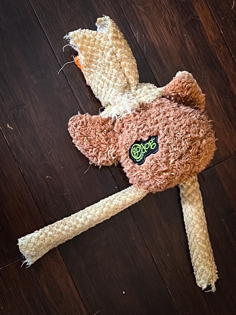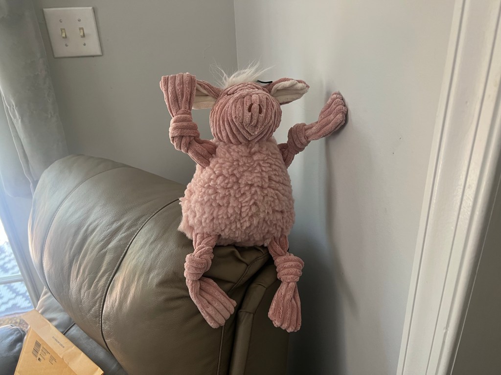 Pud has a new toy to replace her chicken, which is just a torso now! We have moved up to a pink pig.