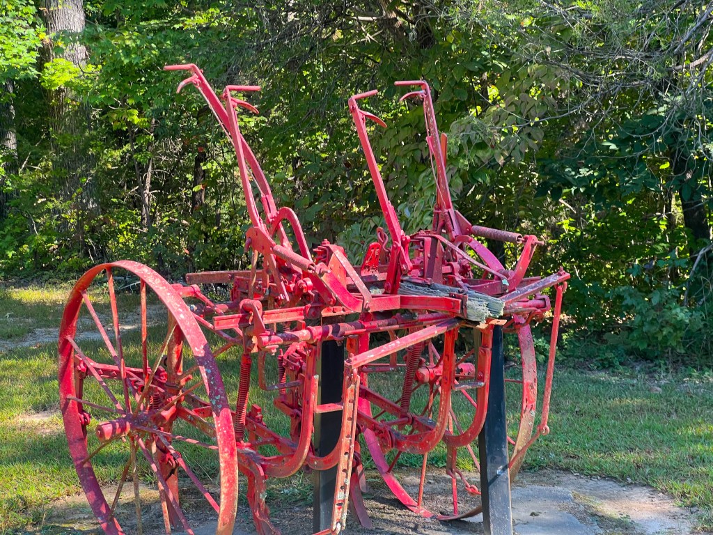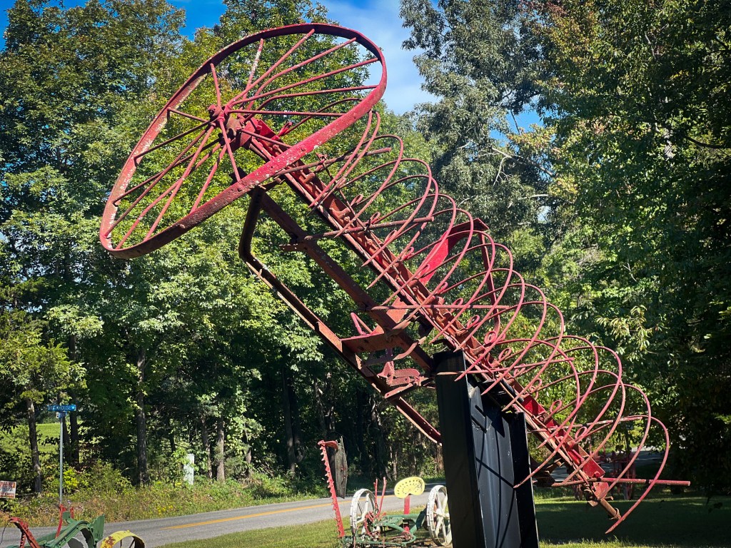 Circe and I went up the road the other way and found a camp, mostly for RVs, but it was interesting. They had all these farm equipment art objects in front. I haven’t a clue of what this has to do with camping, but hey….. Here is what we found. Oh, I also saw this field of round hay bales. They do it differently here. I have only seen square bales in CA. We had to scale a large ditch and climb through a hedge, but the field was worth it, really beautiful…..picturesque.