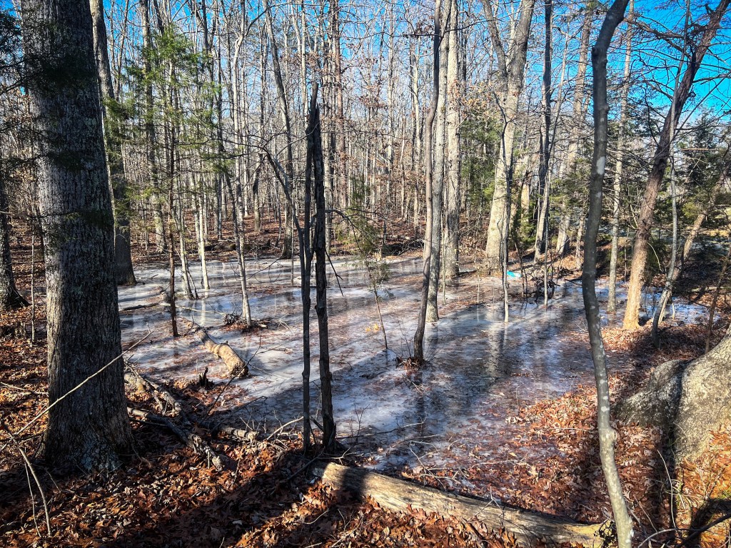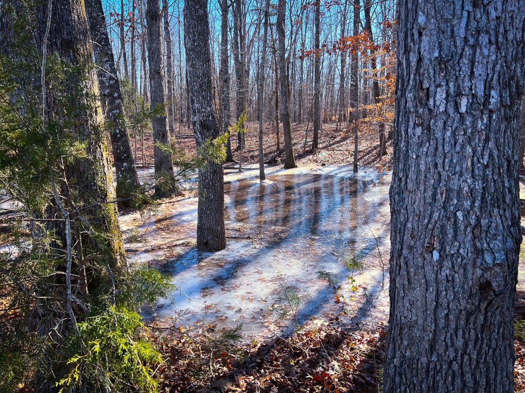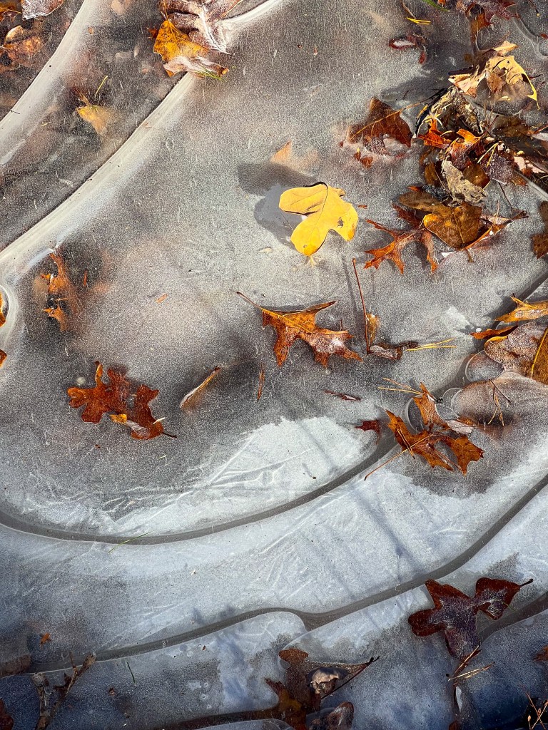 It has rained so much lately that the water isn’t absorbing into the landscape. This with the single-digit weather has created mini ice lakes. Pretty much everywhere there are little ice flows with swirls and crystals mixed with the fallen autumn. it is quite beautiful I am including some pictures from my runs.