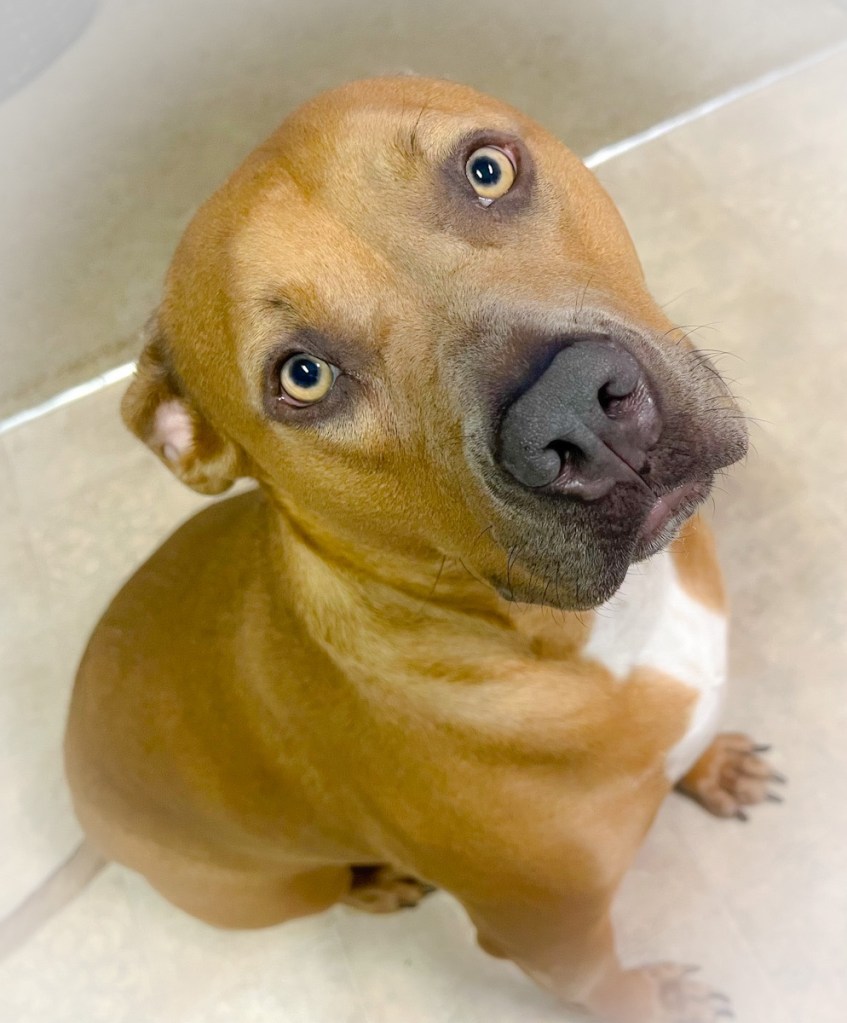 Circe is doing surprisingly good. She seems happy enough. She does need her own yard and place for long walks, but we are managing for now. She hates technology and swats at the computer whenever I am on it. Mostly because I end up getting upset when my neighbor hacks my WiFi and steals my bandwidth…π€¬ She is a plump little sausage now weighing in at 100 lbs and growing. She doesn’t look it though. The vet always says “Really!?” when she gets on the scale. We always have to weigh her a couple of times. Obviously, Circe is not getting as much exercise as she needs. We do play bone and chase each other in the house…That gets dicey sometimes as 100 lb pit running at speed and lunging at you in the hall can create bruising….. She is afraid of the bathroom and will not enter one. She has somewhat conquered her fear of linoleum, but still will hang on the edge of the carpet unless a treat is involved. She has recently decided to boycott puppy food. She wants only treats and will starve herself to get one. We had a standoff the other day and she finally ate her dinner at 10 pm. She then promptly came looking for me to get her treat…..π