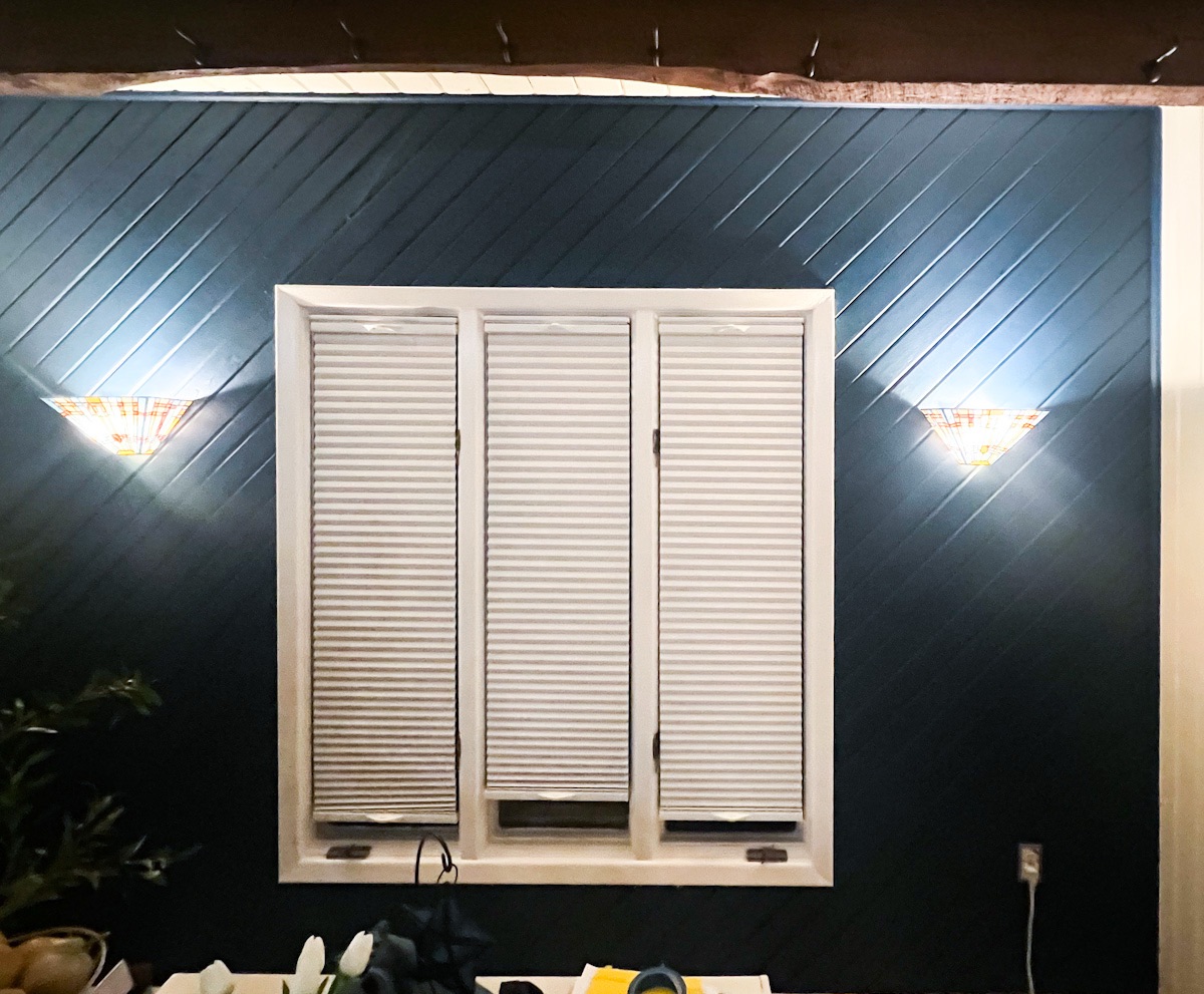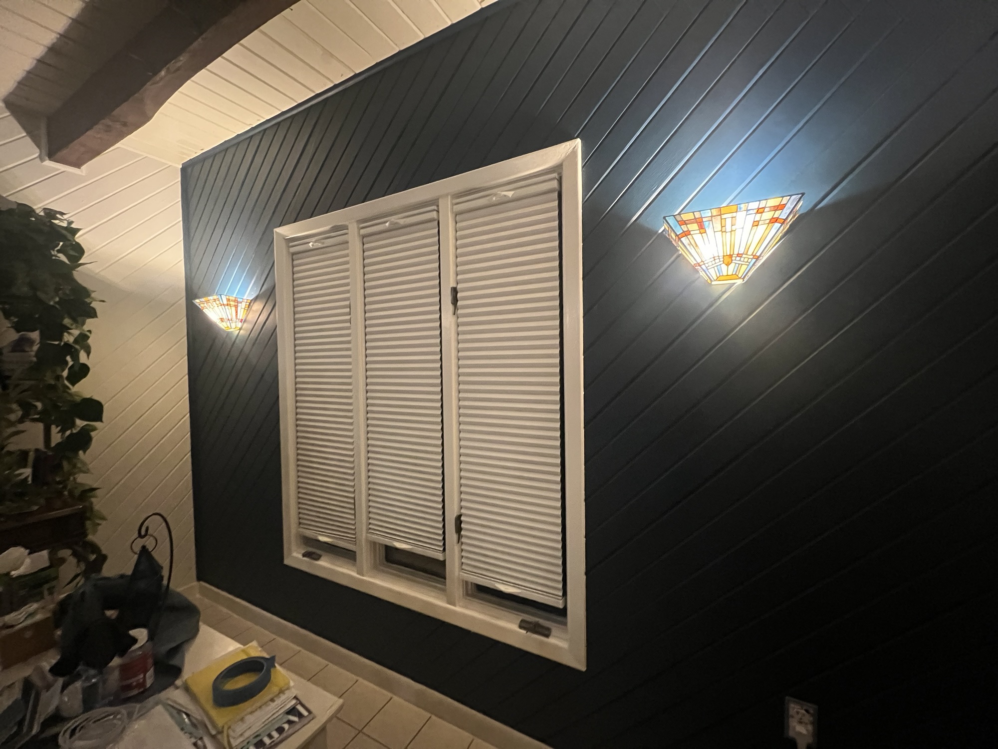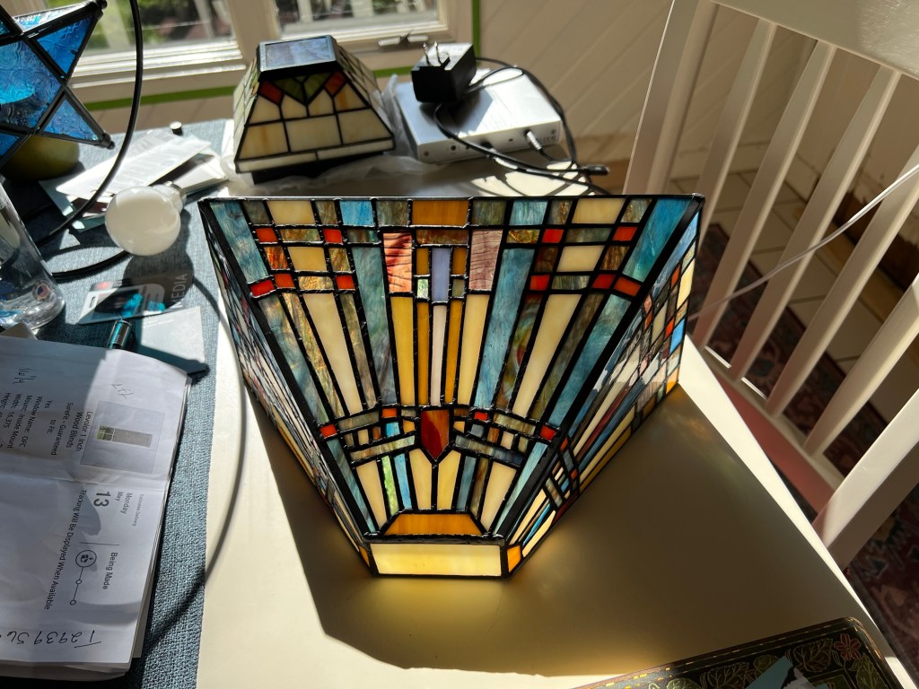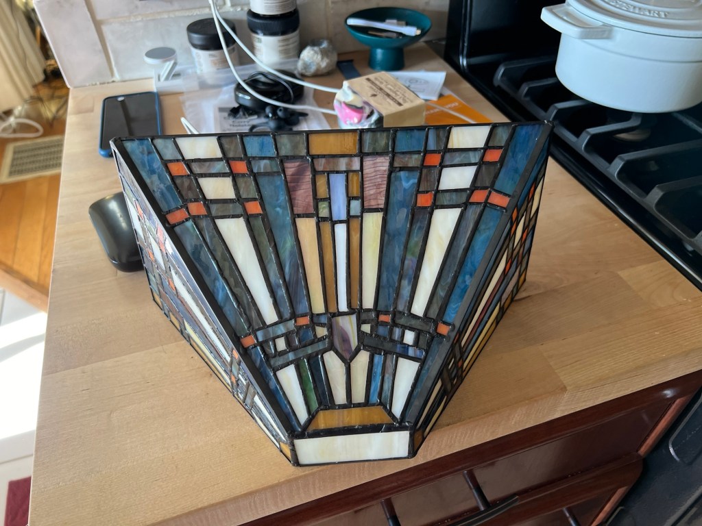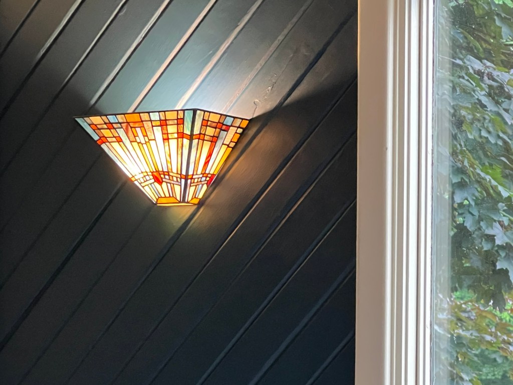 I am remodeling the house in the art deco tradition. I removed the scary 1970’s sconces and found some stained glass ones that fit the era perfectly.