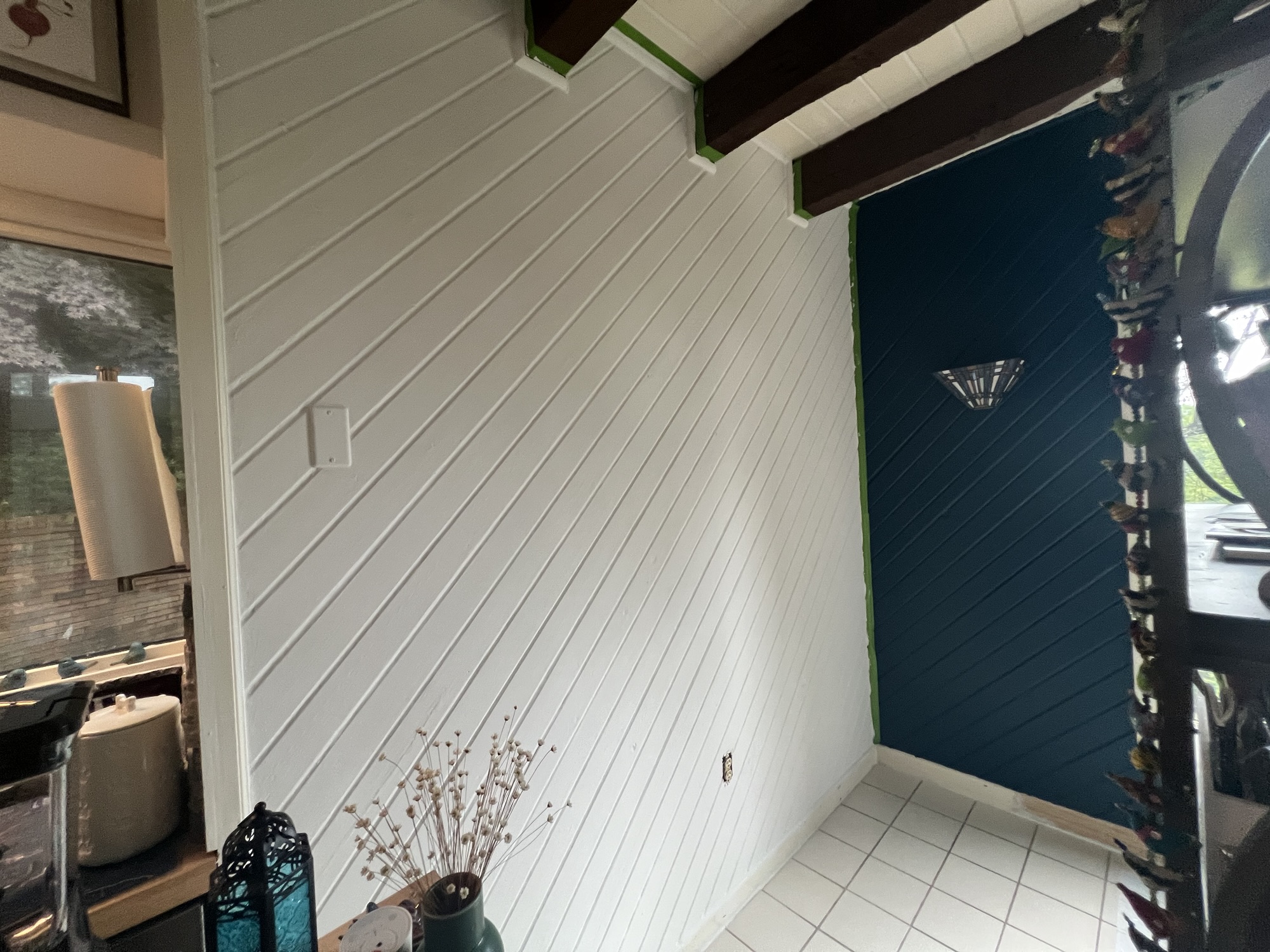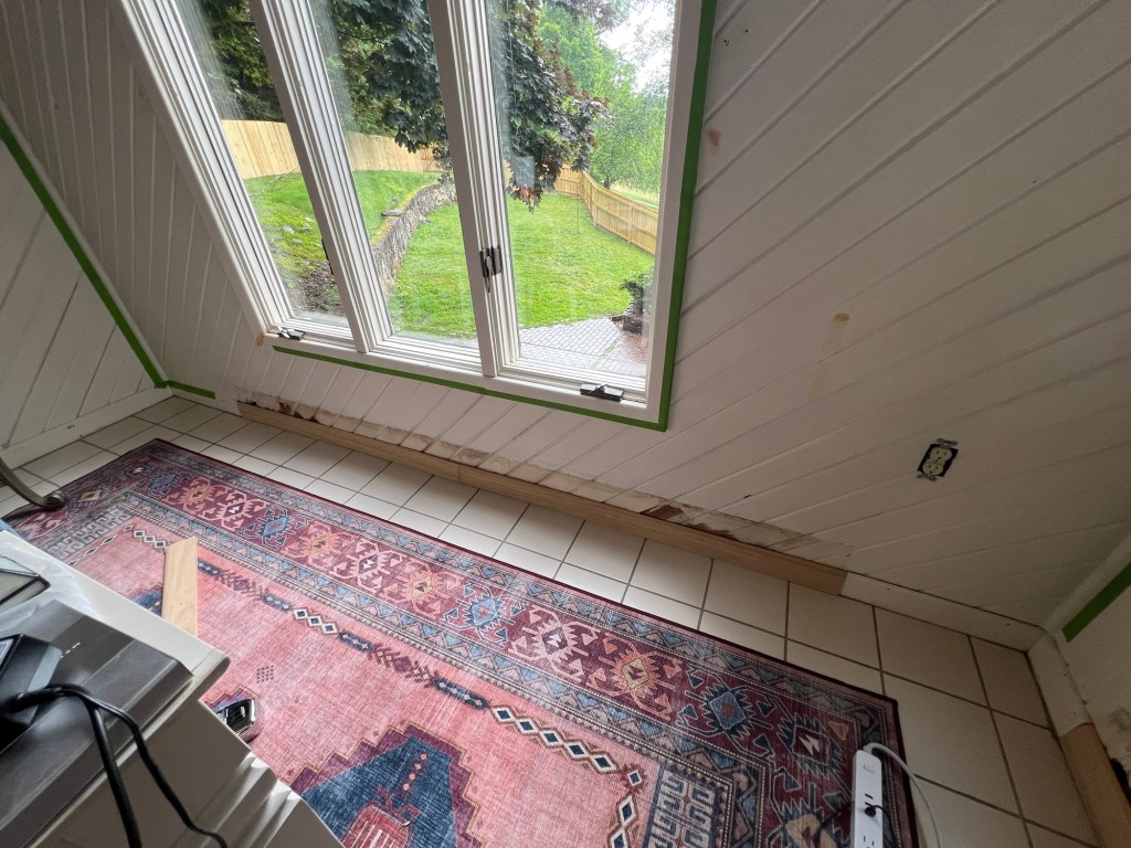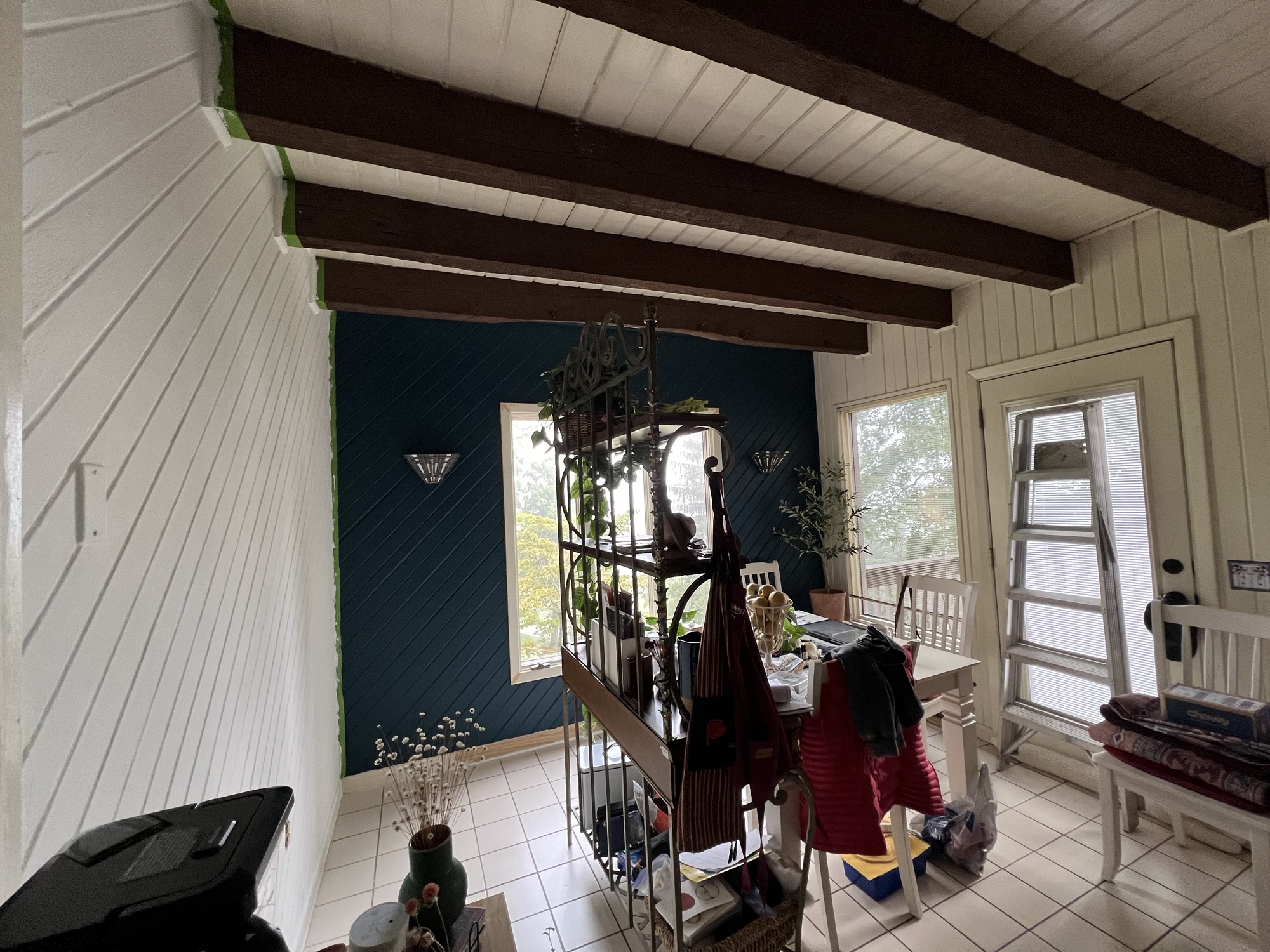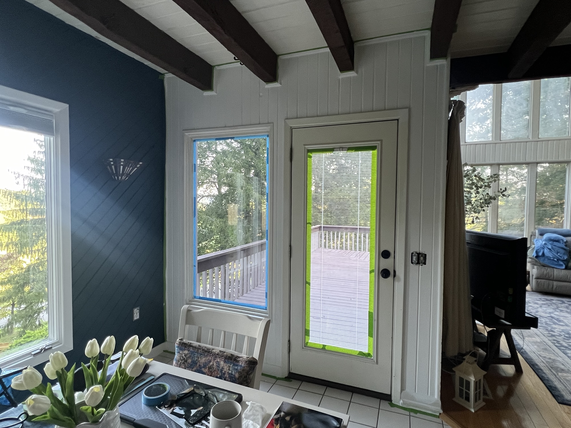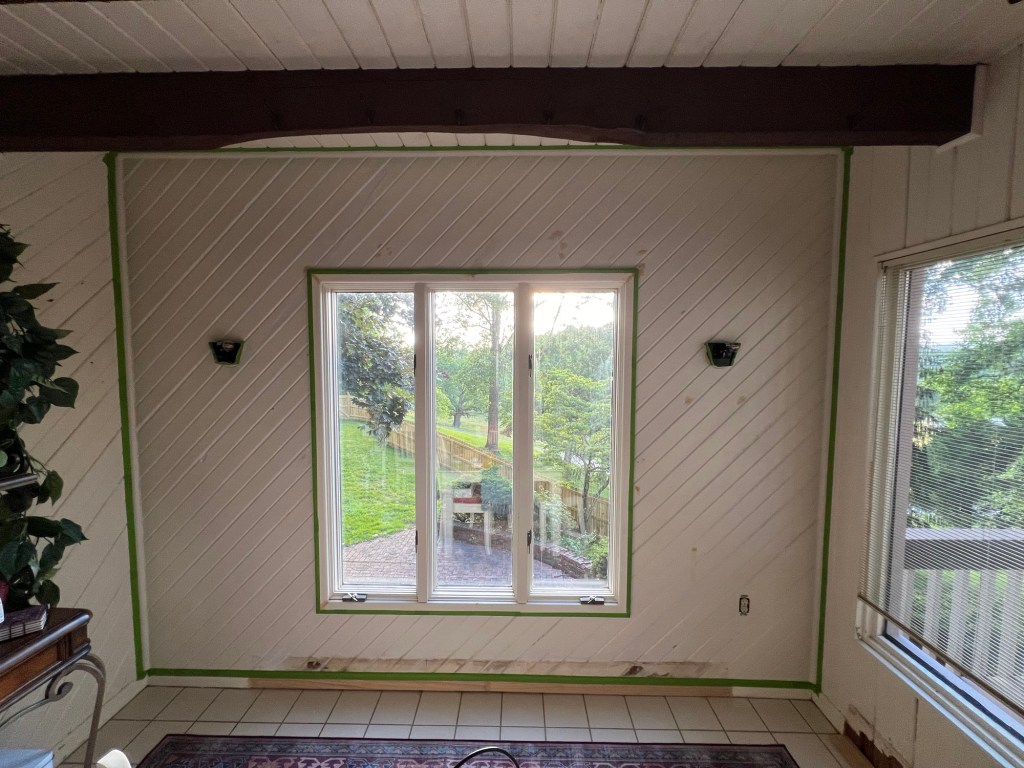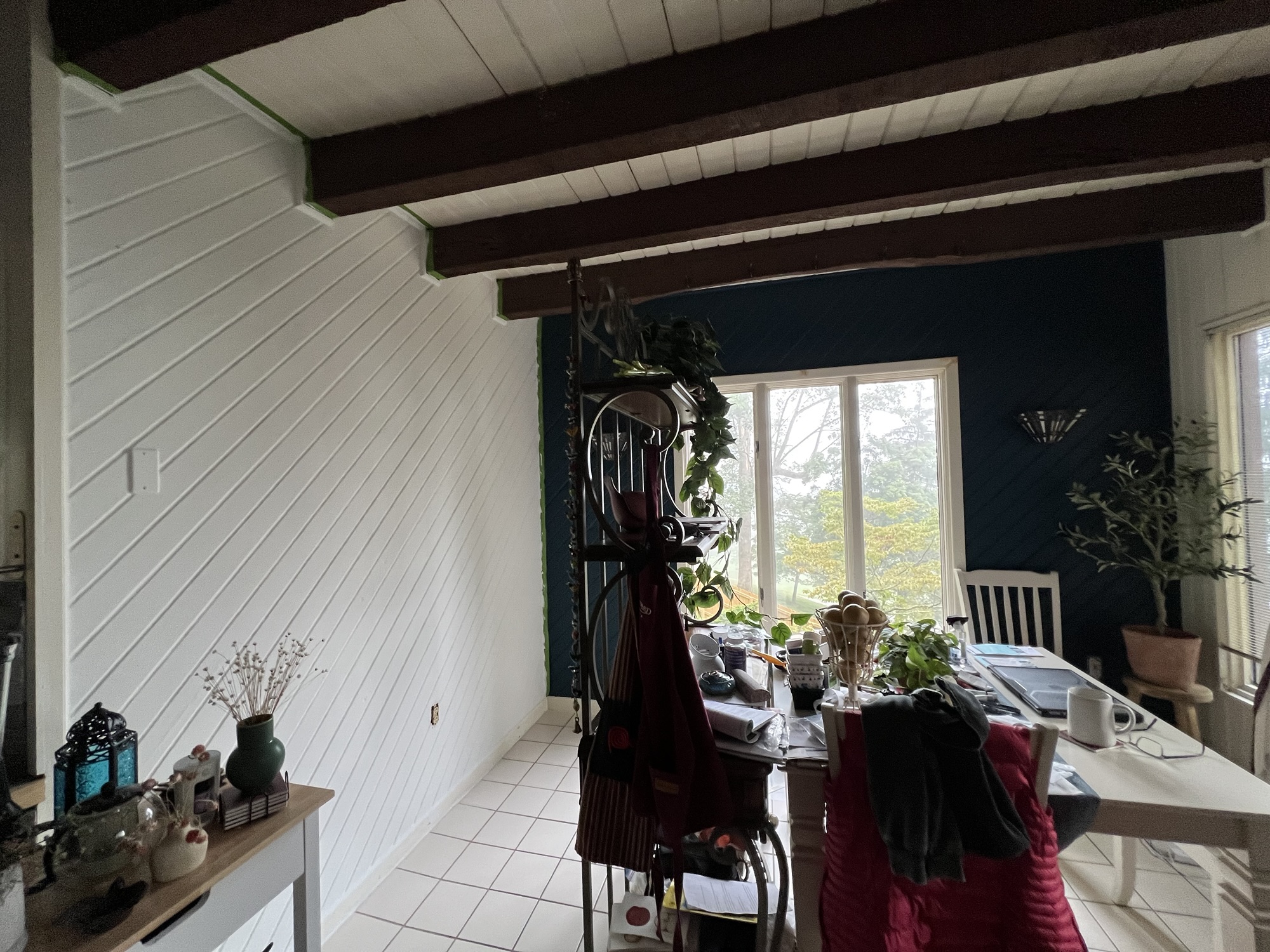 The kitchen has a little nook area with a scenic view. When I moved in it was horrid with holes, drafts, floor heaters and shiny paint. The previous owners, for some strange reason, painted all the walls and ceilings with semi gloss and gloss paint. Some of the trim had flat paint and just partial paint. Some of the trim was just stripped off and missing also. So, it was a mixed bag.