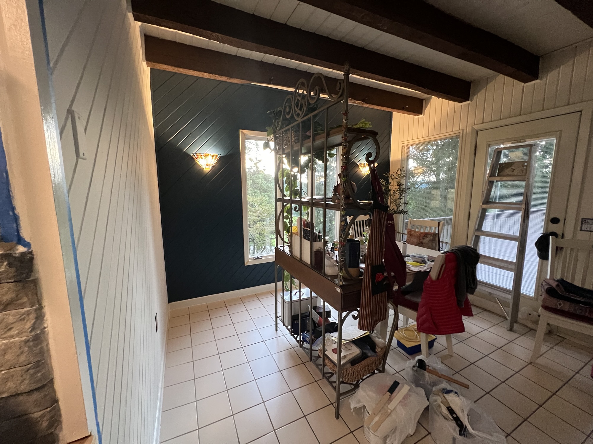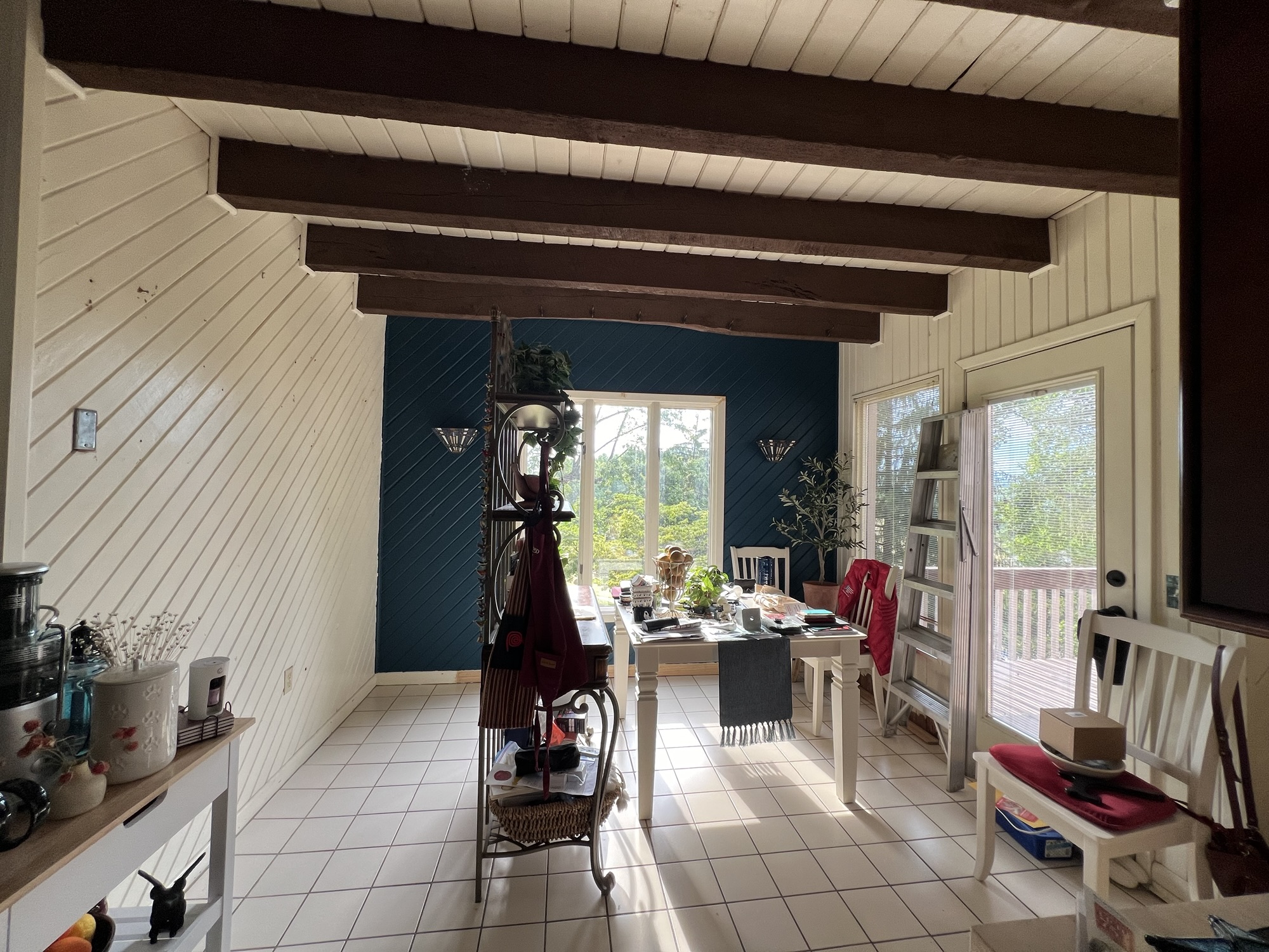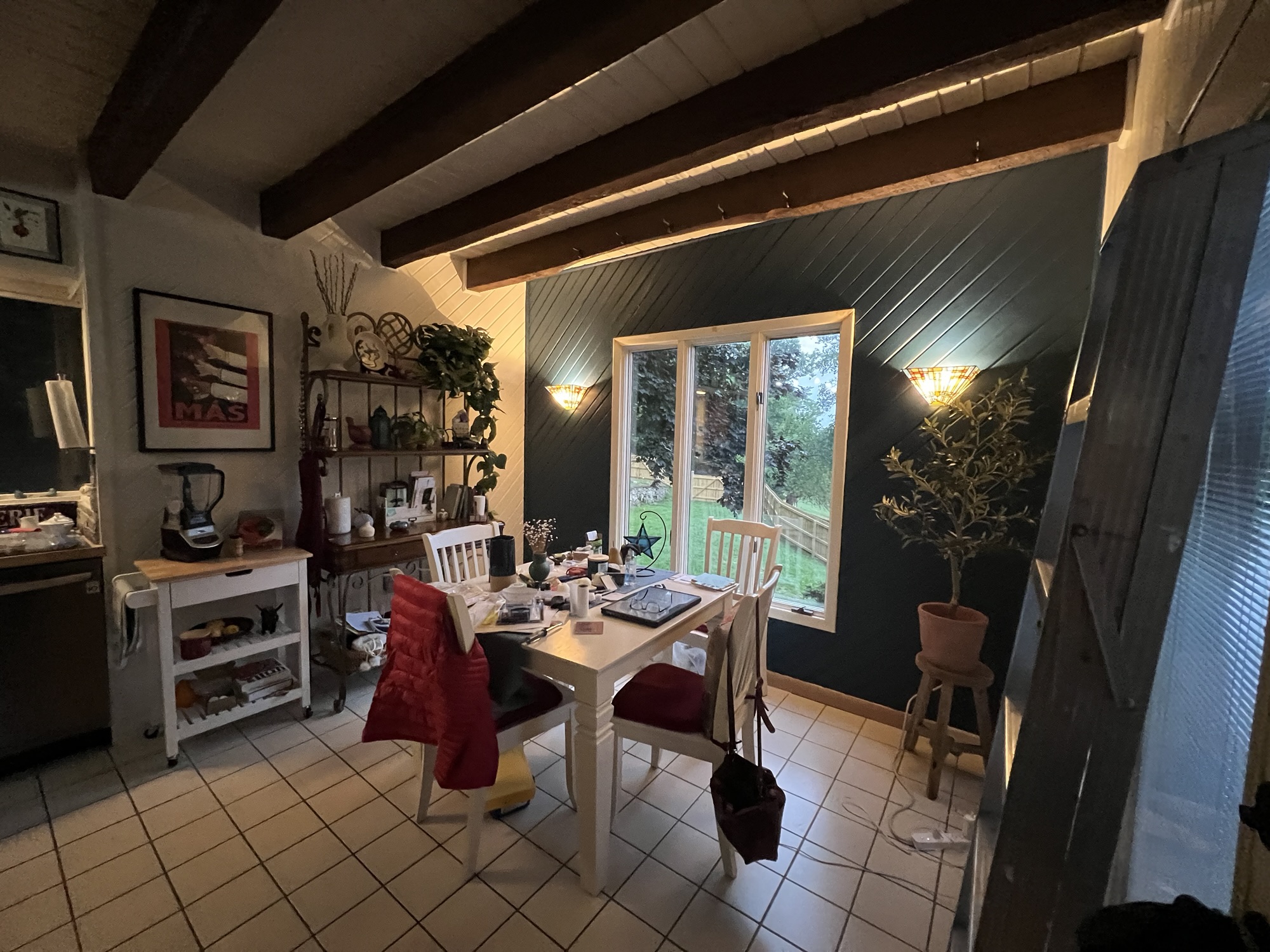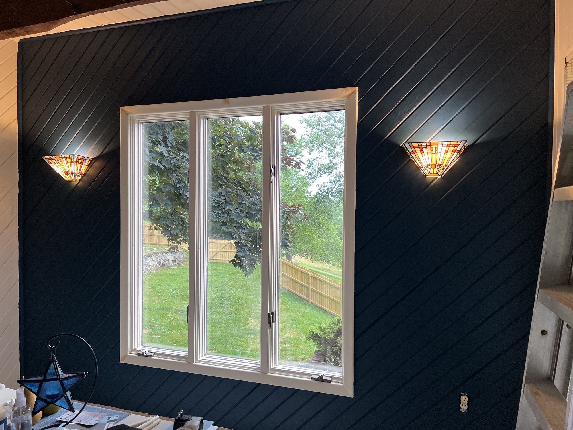 The kitchen has a little nook area with a scenic view. When I moved in it was horrid with holes, drafts, floor heaters and shiny paint. The previous owners, for some strange reason, painted all the walls and ceilings with semi gloss and gloss paint. Some of the trim had flat paint and just partial paint. Some of the trim was just stripped off and missing also. So, it was a mixed bag.