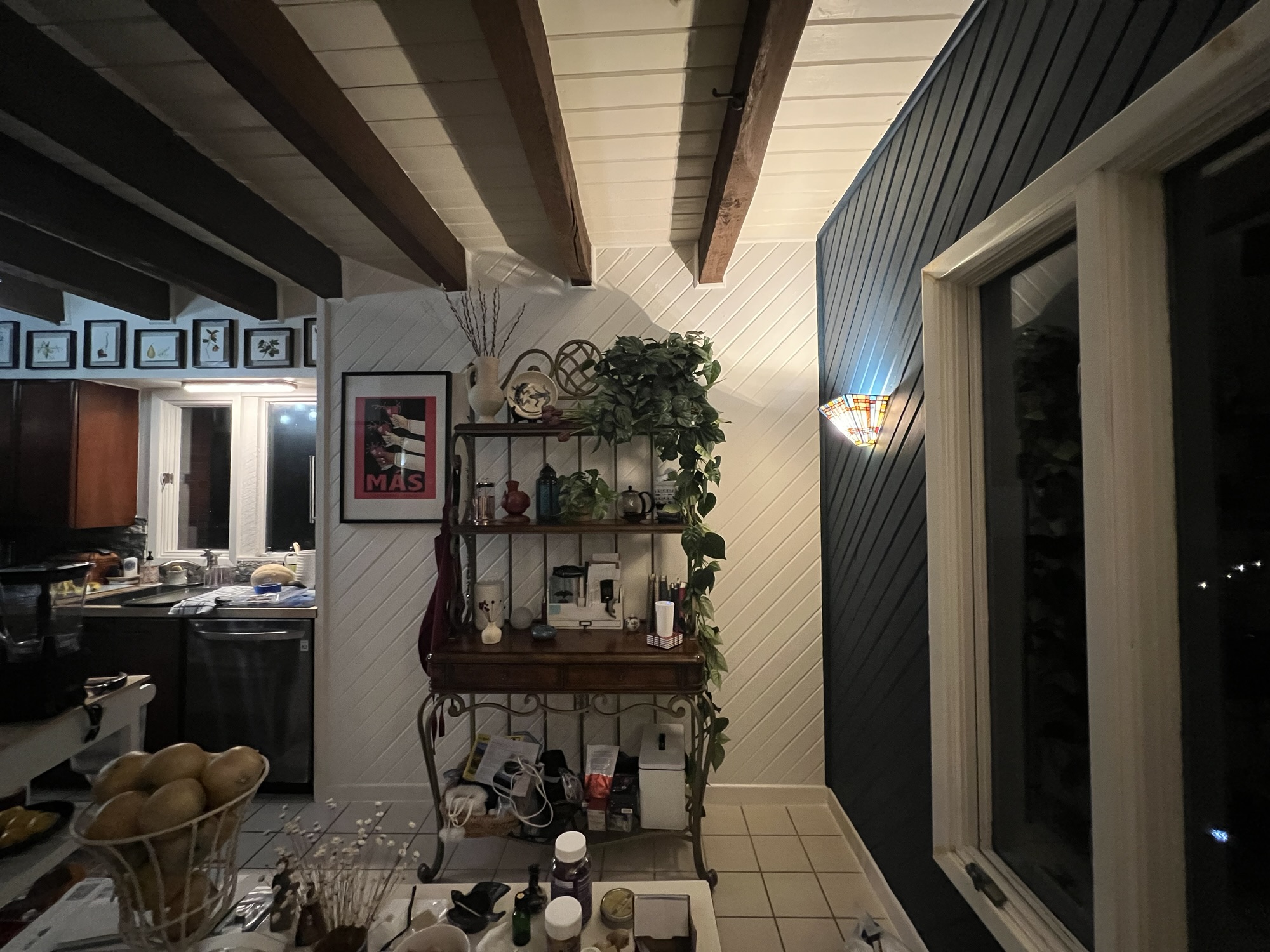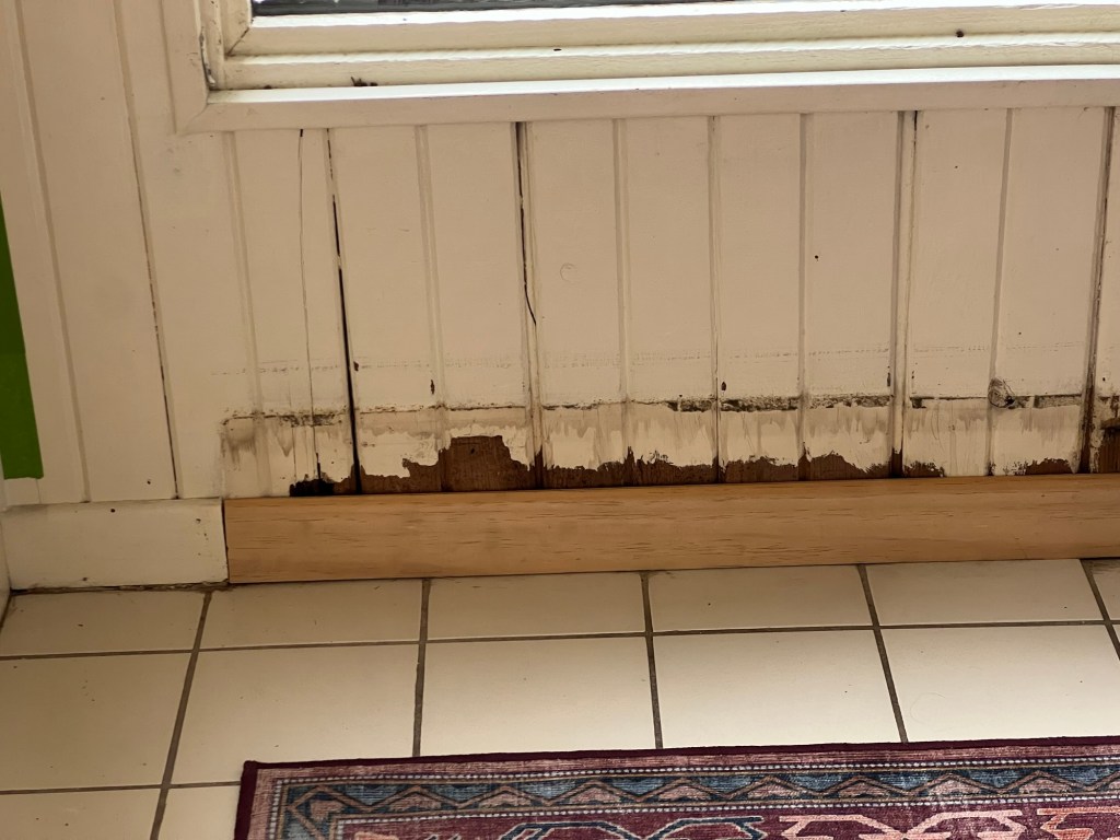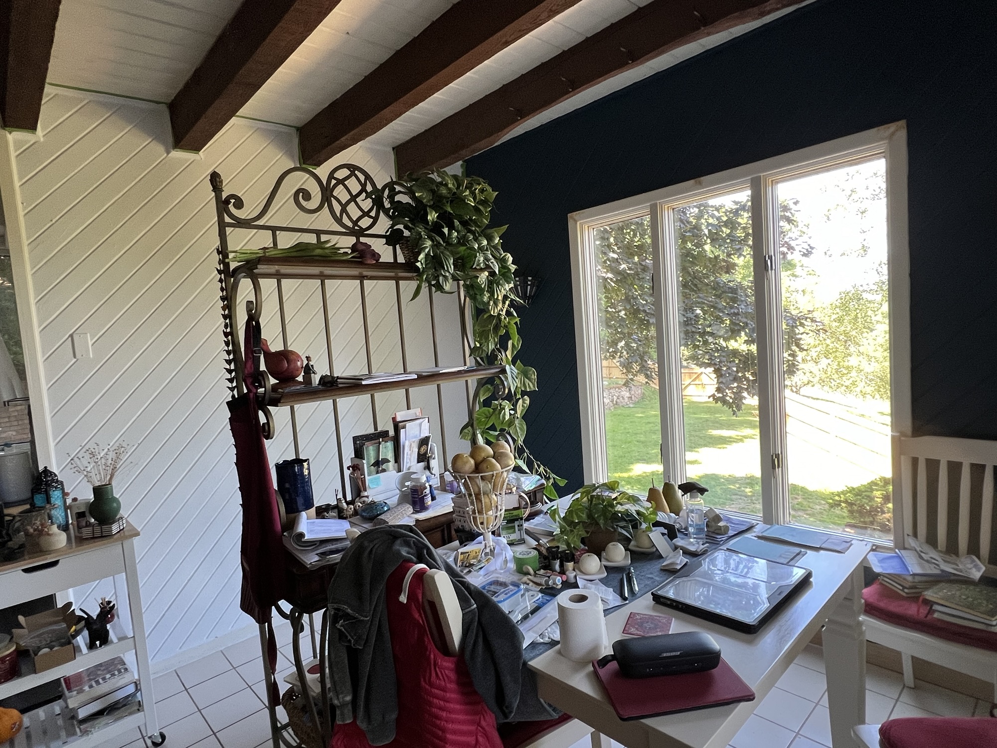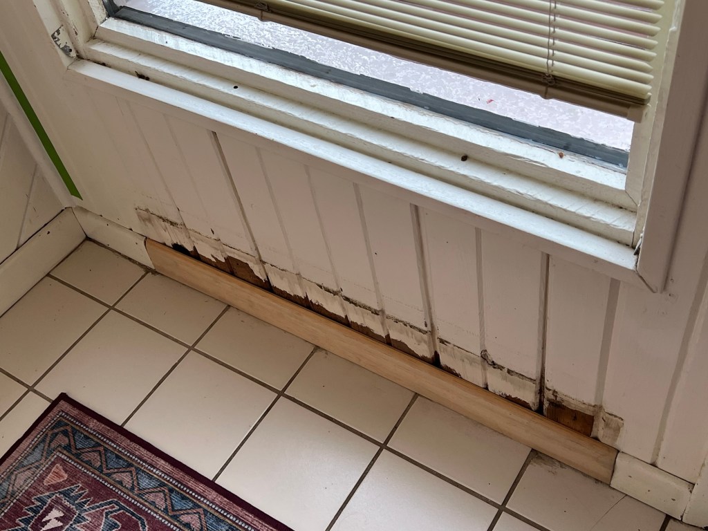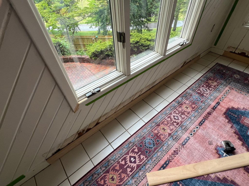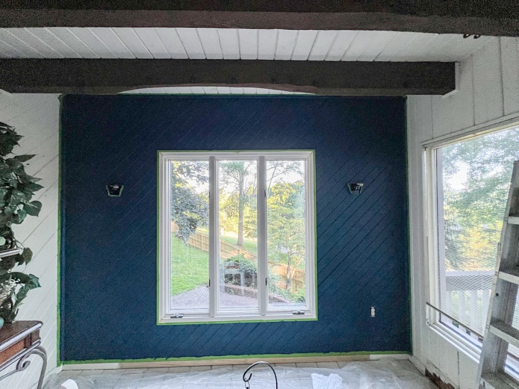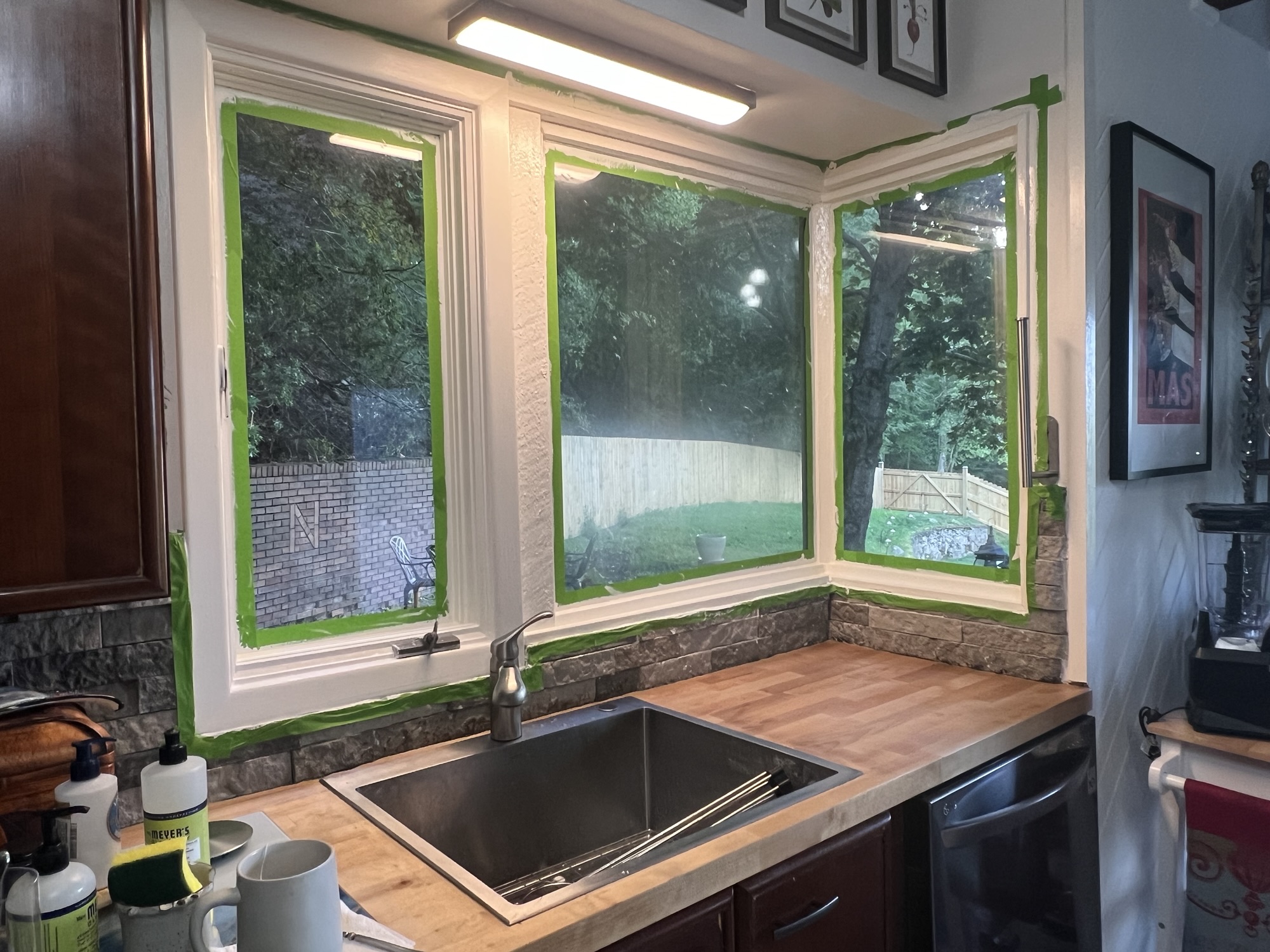 The kitchen has a little nook area with a scenic view. When I moved in it was horrid with holes, drafts, floor heaters and shiny paint. The previous owners, for some strange reason, painted all the walls and ceilings with semi gloss and gloss paint. Some of the trim had flat paint and just partial paint. Some of the trim was just stripped off and missing also. So, it was a mixed bag.
