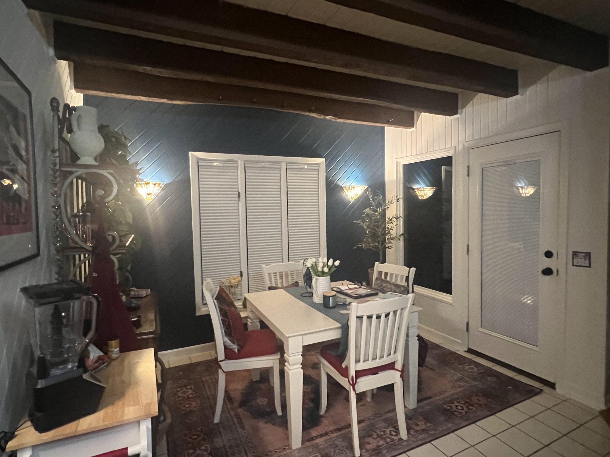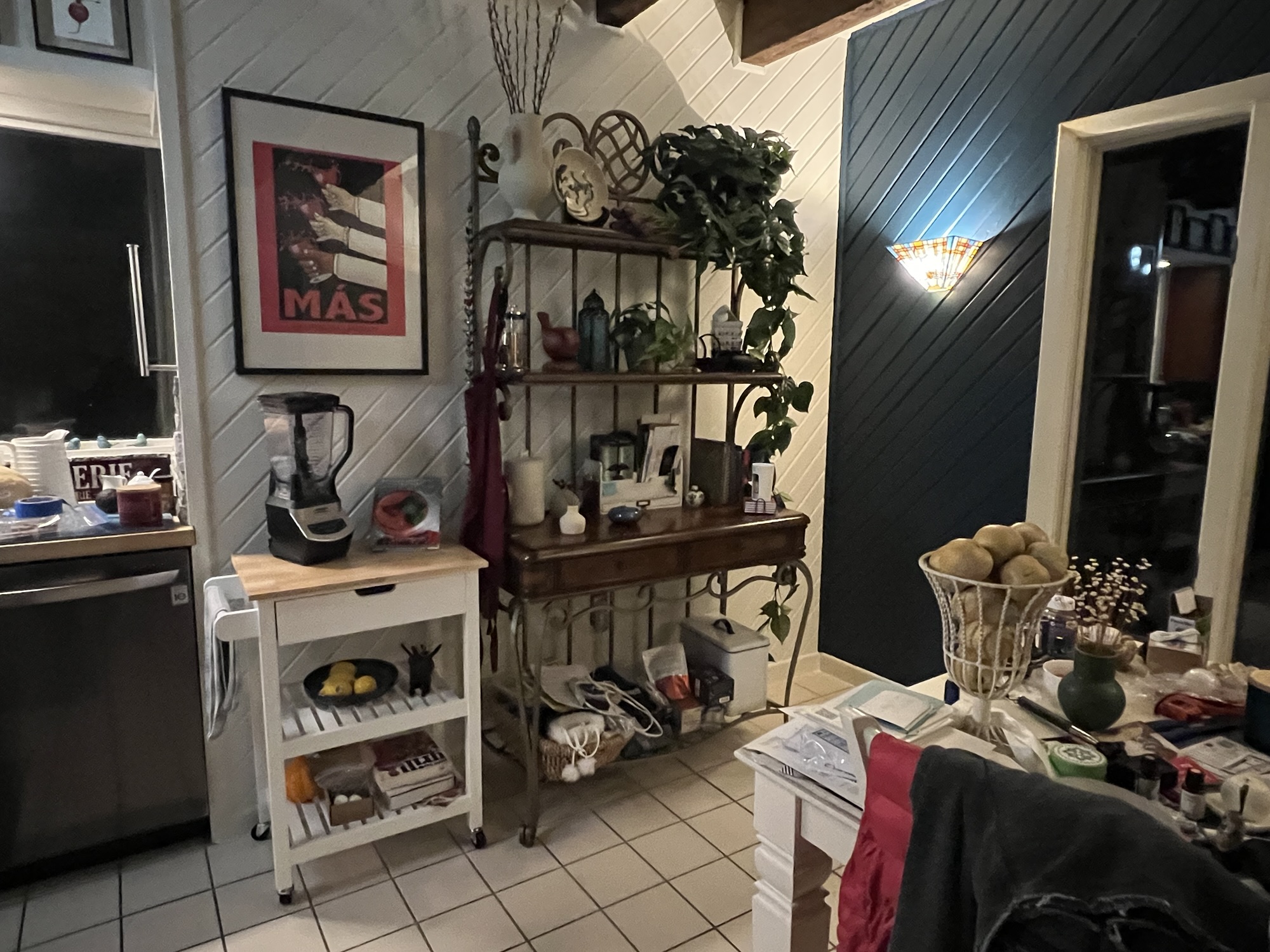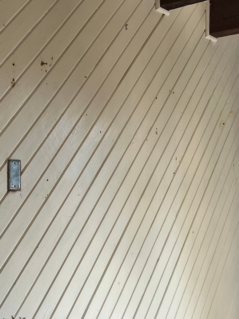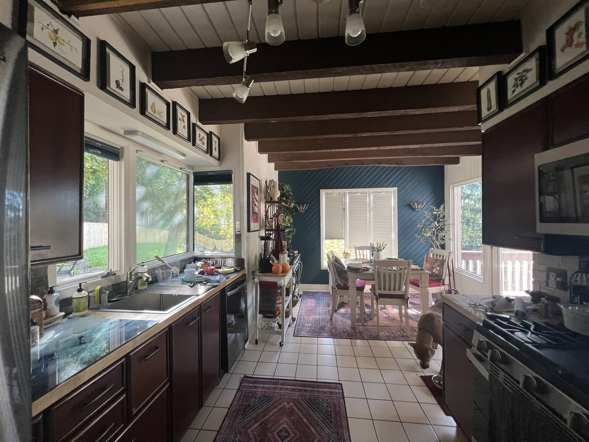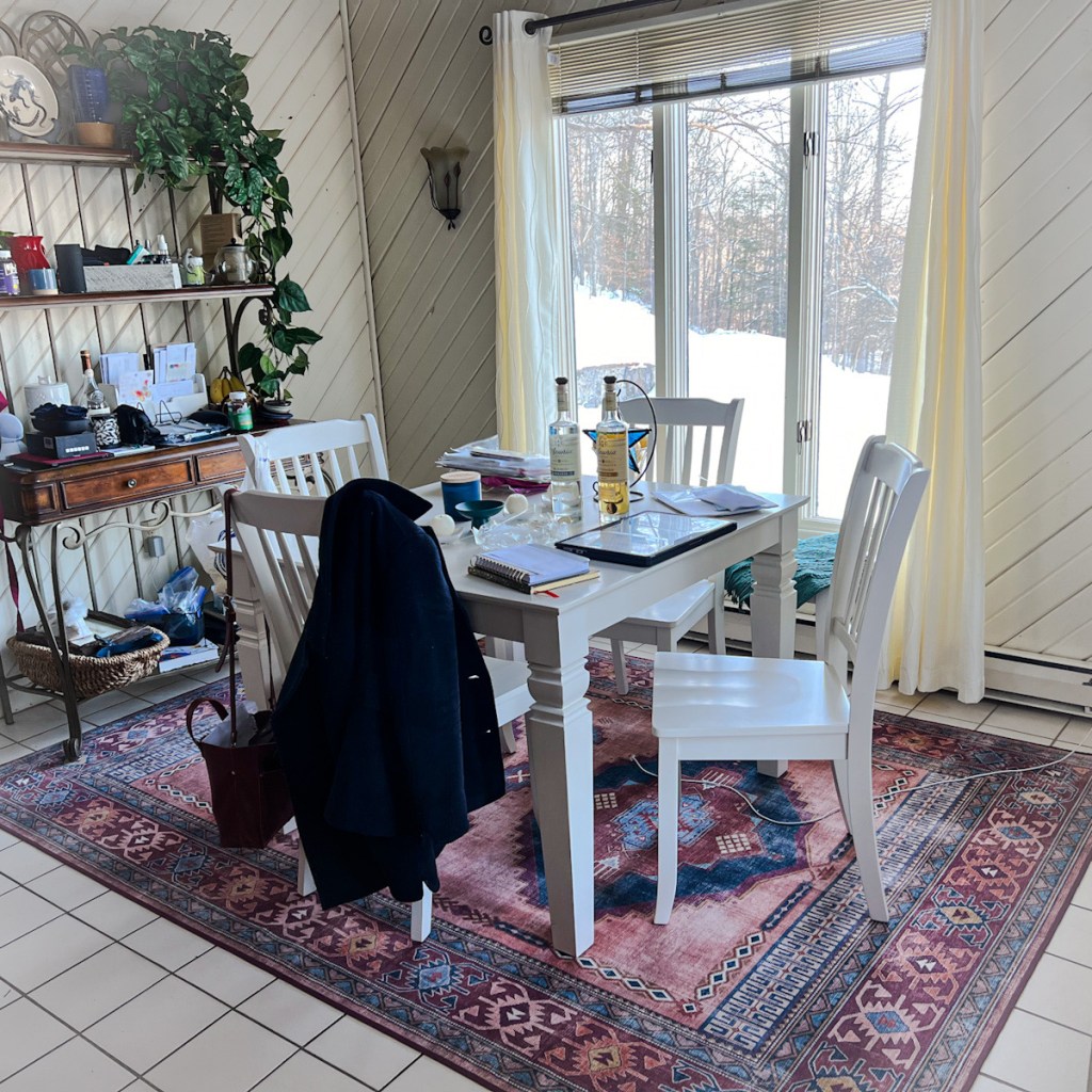 The kitchen has a little nook area with a scenic view. When I moved in it was horrid with holes, drafts, floor heaters and shiny paint. The previous owners, for some strange reason, painted all the walls and ceilings with semi gloss and gloss paint. Some of the trim had flat paint and just partial paint. Some of the trim was just stripped off and missing also. So, it was a mixed bag.
