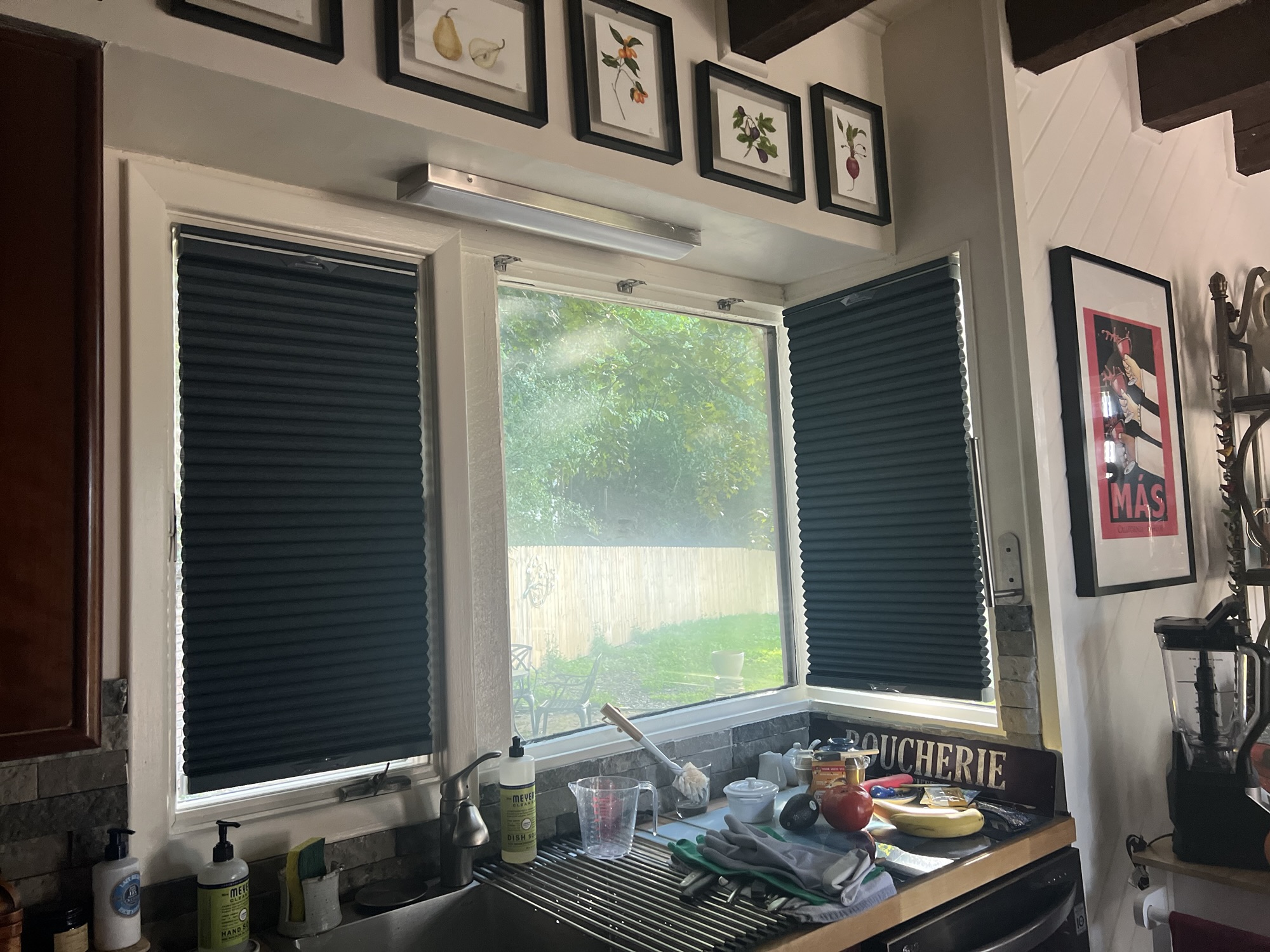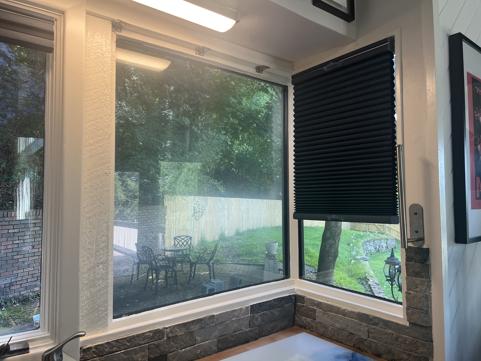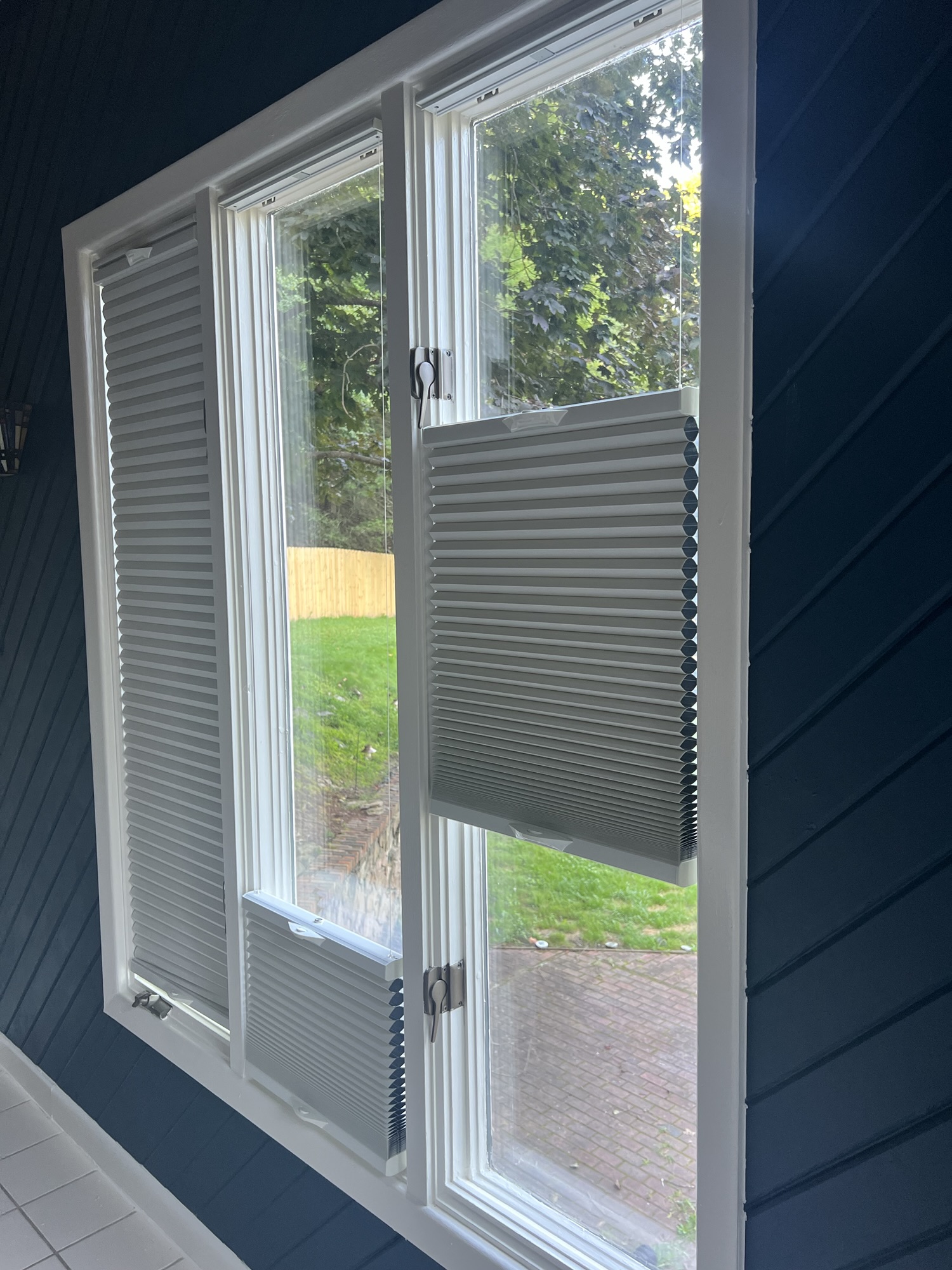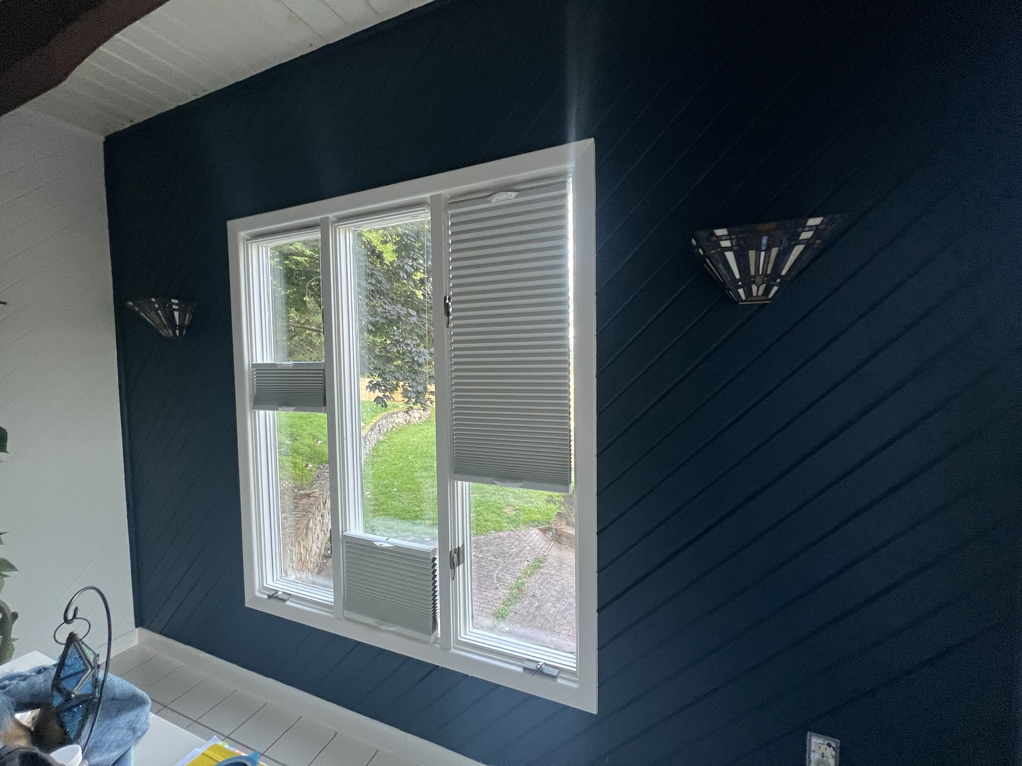 I painted the other walls Grecian white and used a flat paint. I chose Swiss flour for the color for the shades in the big window and the mediterranean blue for all the other shades. The shades are top down/bottom up style so I can adjust for the sun.