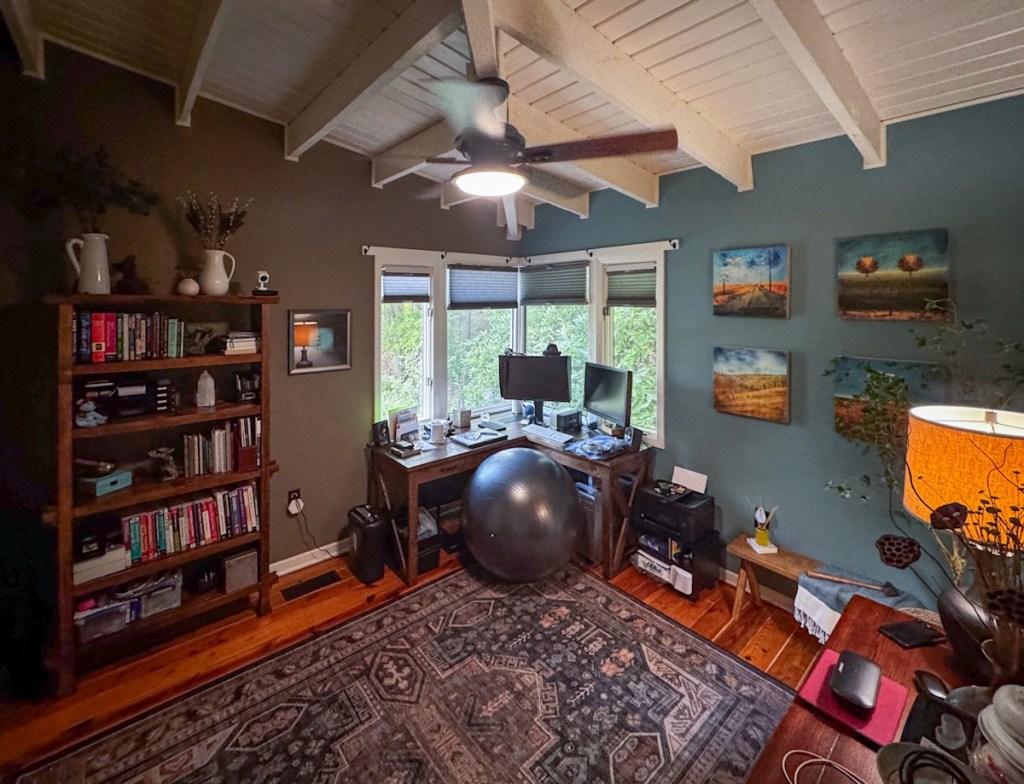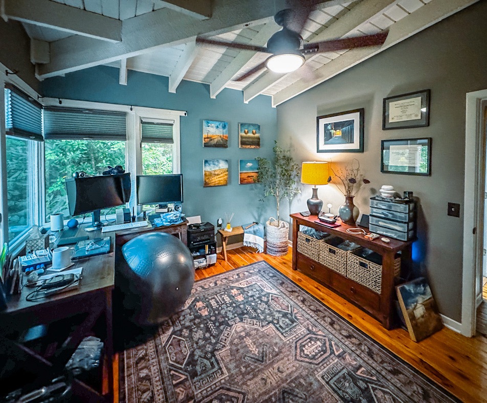 I started with the far wall that is the blue wall. It just felt good to get some color in there. I pulled the three colors from the carpet and did color blocking to add some dimension to the room. It actually opened it up and makes it feel more spacious. It is lovely room for an office.