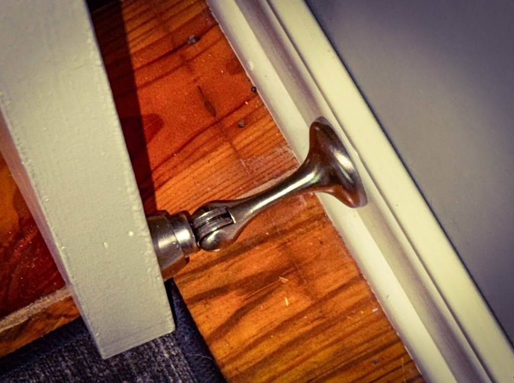 So, instead of door stopper, they put in some strange jam at the top back side of the door. The function seems to be to make a hole in the trim. ???