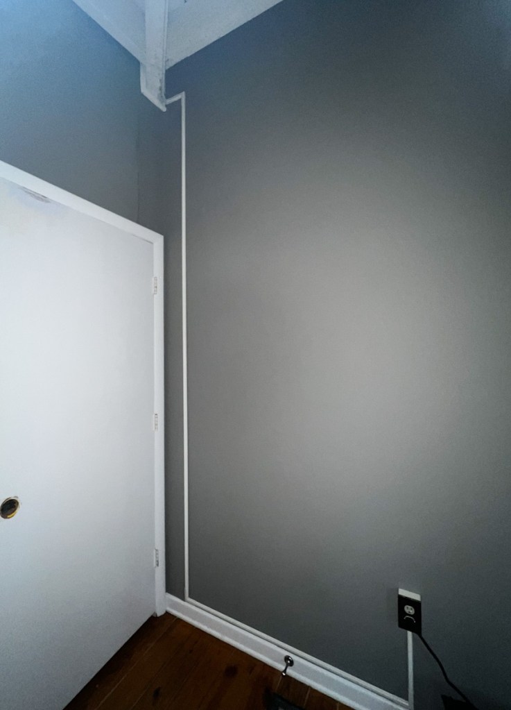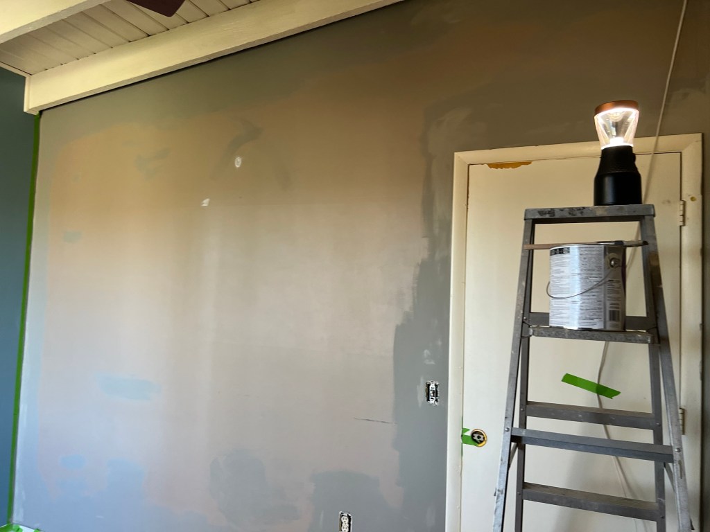 The next two walls were the wall to the right of the blue wall and the next one over. They are a warm stone color. The last wall is a soft gray color that paired well with the other two colors.