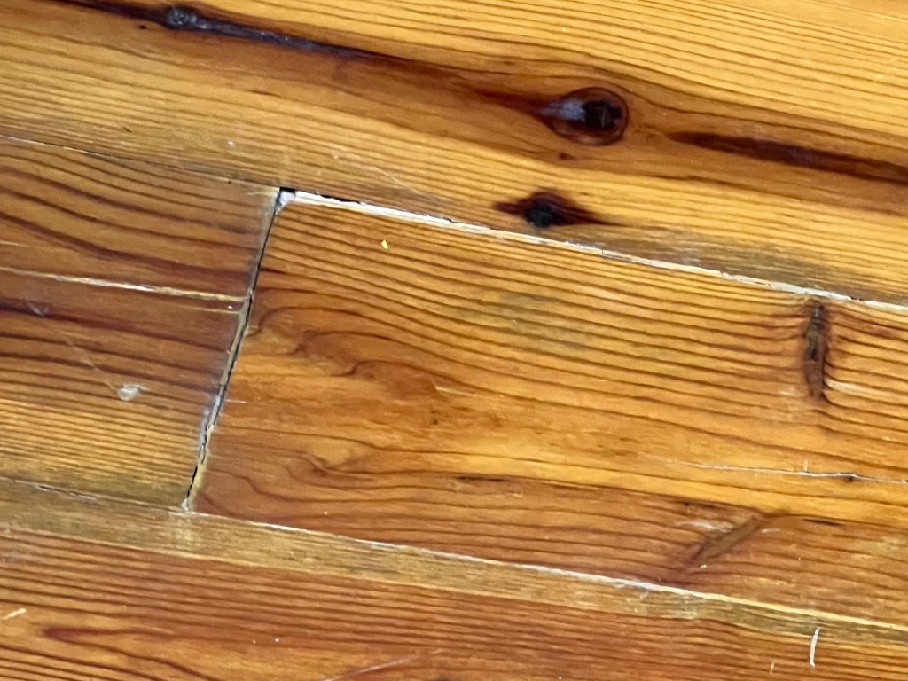 The plank flooring was actually the sub-floor. They removed some really tragic ice blue shag carpet. (what were they thinking when they invented shag carpet?) They left the carpet nails and side board, which I promptly cut my feet repeatedly by stepping on these. There was some massive space between the boards, but not enough to use the rope method to seal between the boards. I ended up having to do a soft resurface of the whole floor. I had to get wood putty and seal between ALL the boards. This took time as my knees didn’t want to be cramped for 8-10 hours at a stretch. I should have got one of those garden mat things. The ones that look like boogy boards for cats.