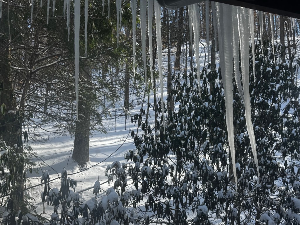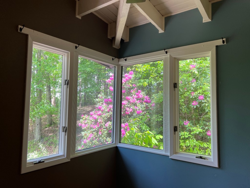 It looks out on the little valley and up on the right is a tree filled hill. There are these giant fushia flowers that bloom off some kind of tree/bush on the side that fill the window with bright color in the spring.